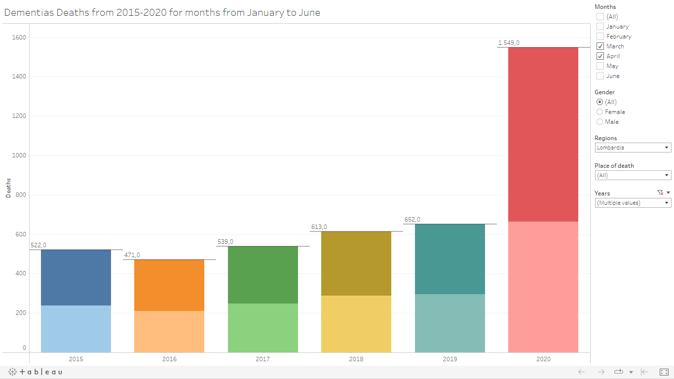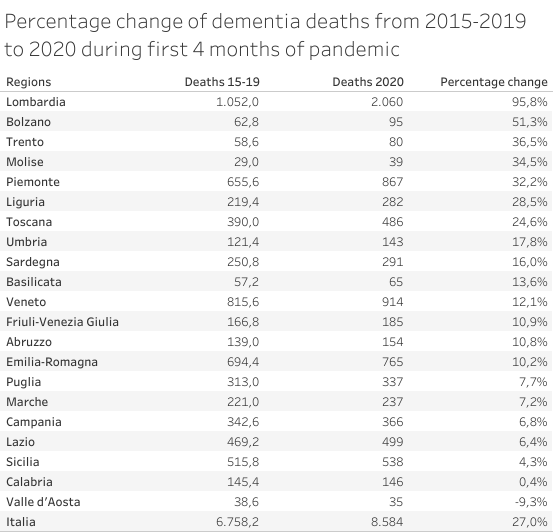 Lombardia, the most populated and industrialized Italian region, was the epicentre of the first wave (March and April 2020) of COVID-19 in Italy and it results in a significant increase in dementia deaths during these months.